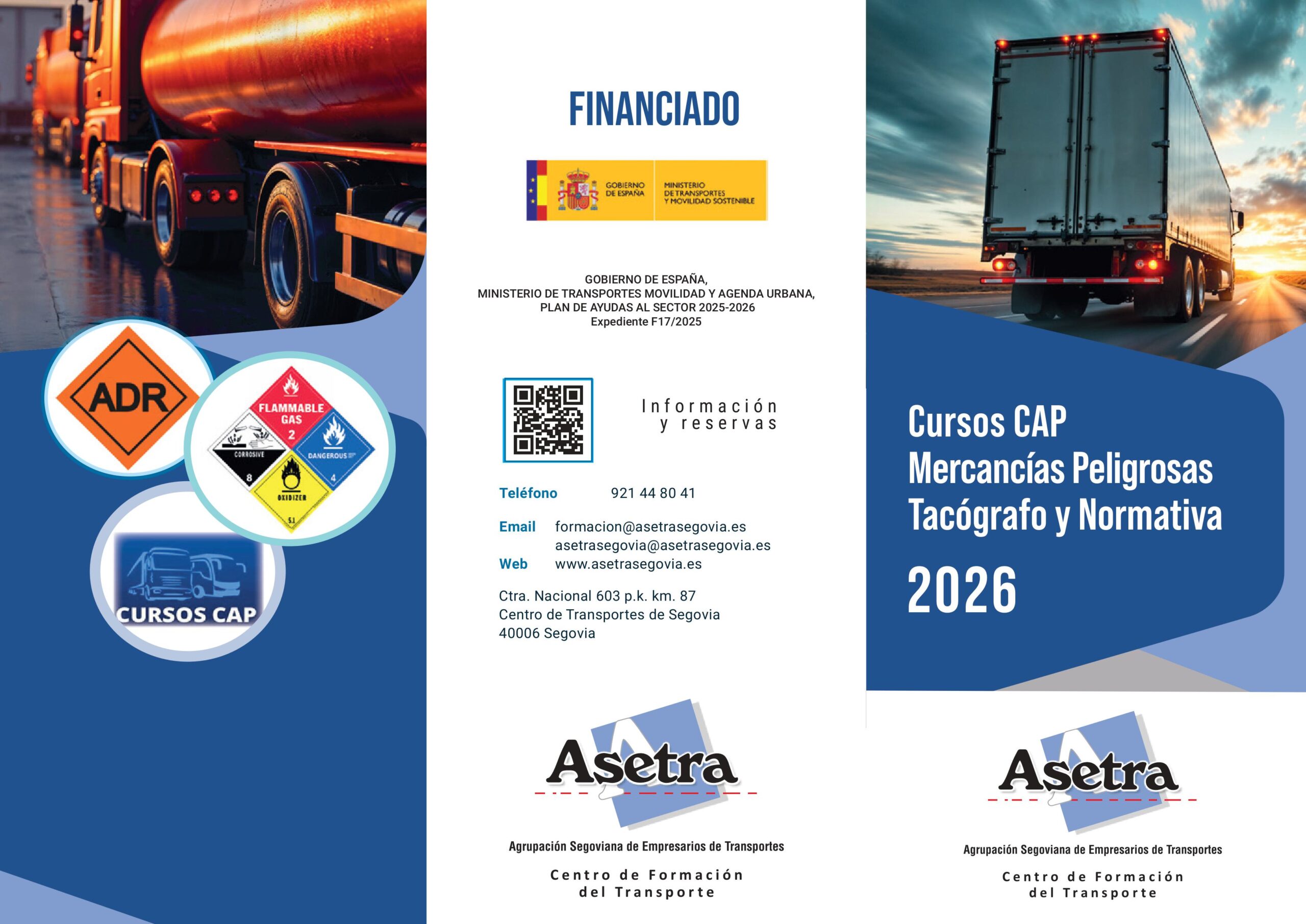 Cursos programados por Asetra de noviembre/2025 a junio/2026, financiados por el Gobierno de España; Ministerio de Transportes, Movilidad y Agenda Urbana; Plan de Ayudas al Sector 2026-2026, expediente F17/2025. Las fechas de celebración de los cursos pueden verse sujetas a cambios por necesidades de la organización. En este enlace pueden descargar el folleto. Inscripciones enviando un correo electrónico a formacion@asetrasegovia.es.