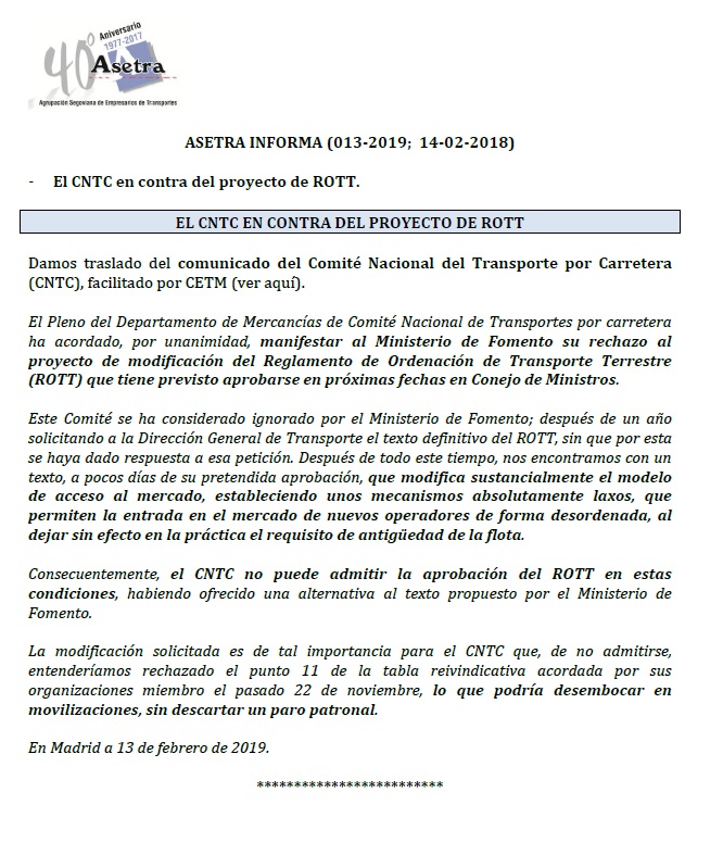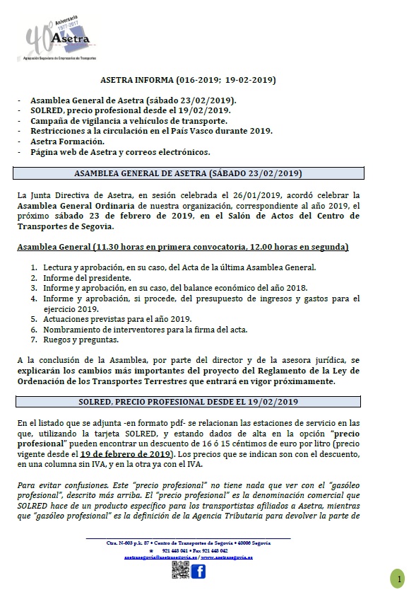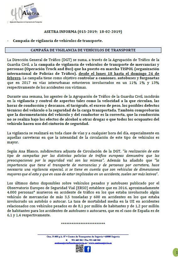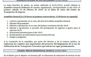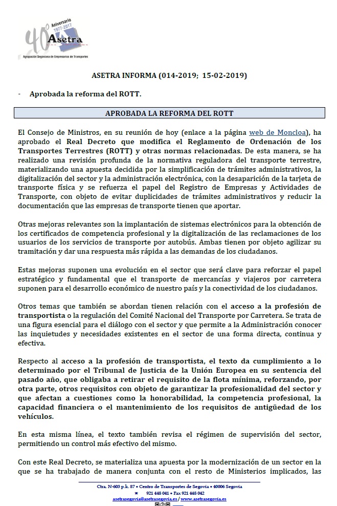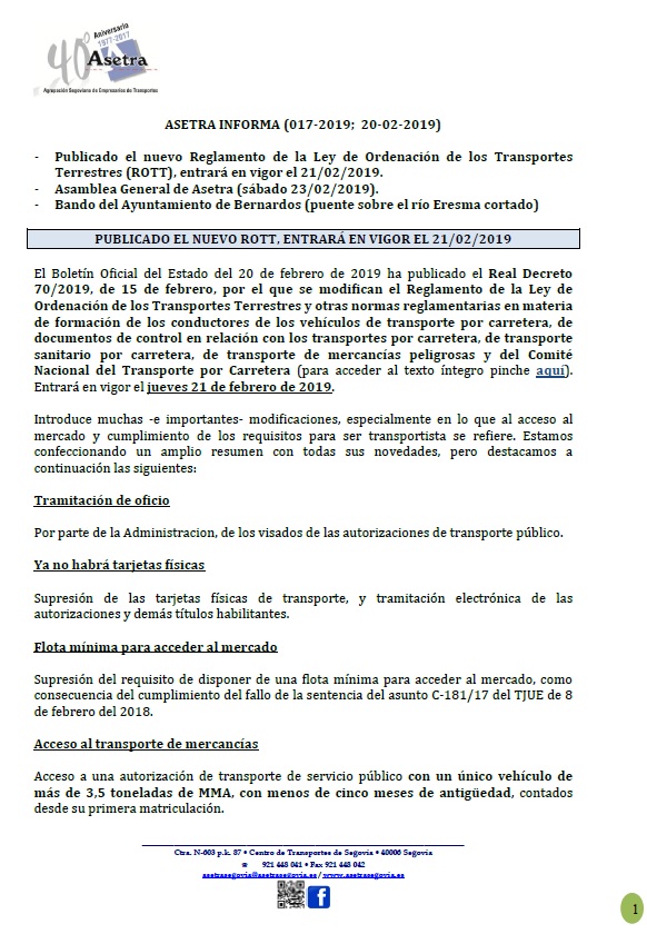 Publicado el nuevo Reglamento de la Ley de Ordenación de los Transportes Terrestres (ROTT), entrará en vigor el 21/02/2019. Asamblea General de Asetra (sábado 23/02/2019). Bando del Ayuntamiento de Bernardos (puente sobre el río Eresma cortado). Para descargar el archivo pincha aquí.