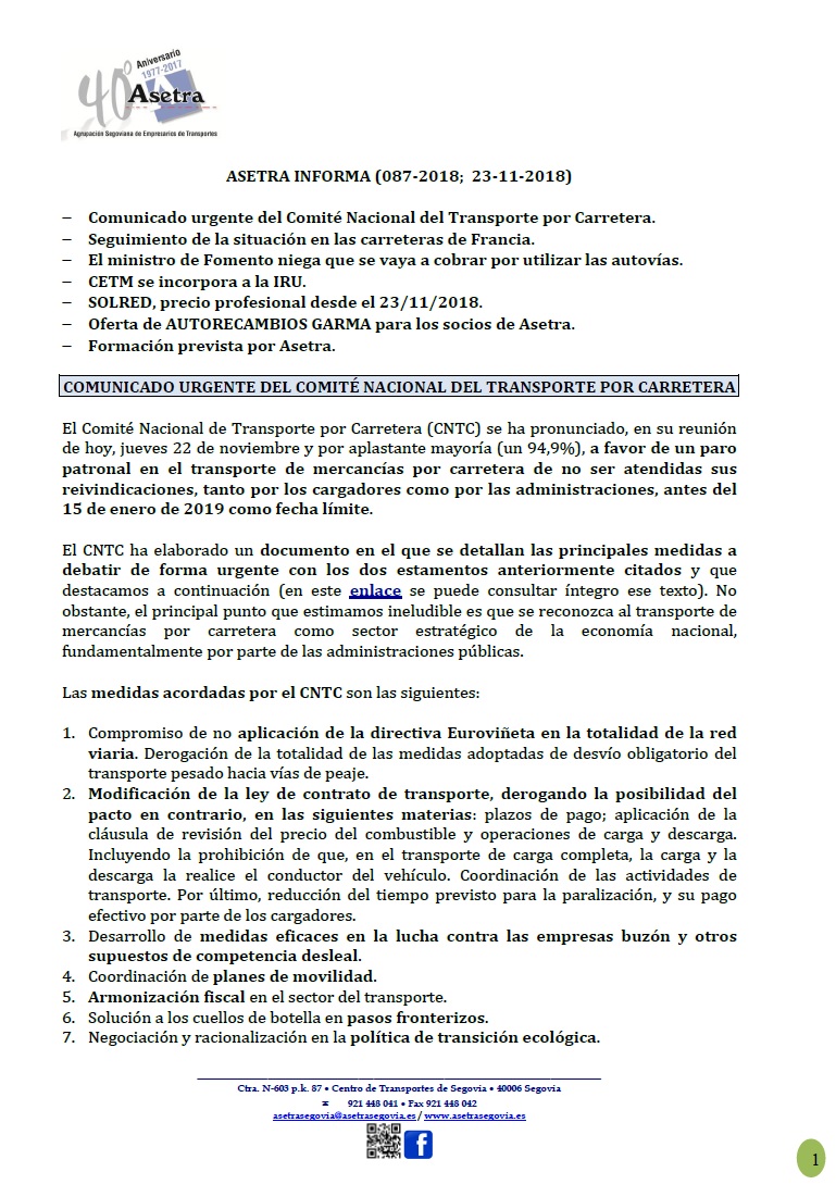 Comunicado urgente del Comité Nacional del Transporte por Carretera. Seguimiento de la situación en las carreteras de Francia. El ministro de Fomento niega que se vaya a cobrar por utilizar las autovías. CETM se incorpora a la IRU. SOLRED, precio profesional desde el 23/11/2018. Oferta de AUTORECAMBIOS GARMA para los socios de Asetra. Formación prevista [...]