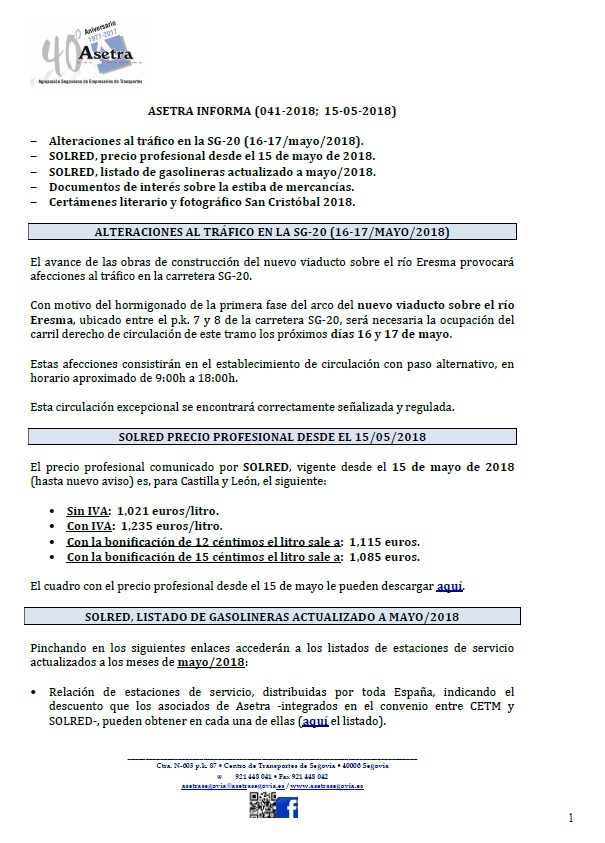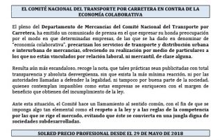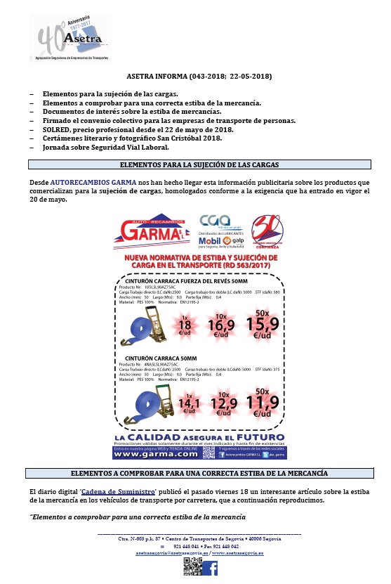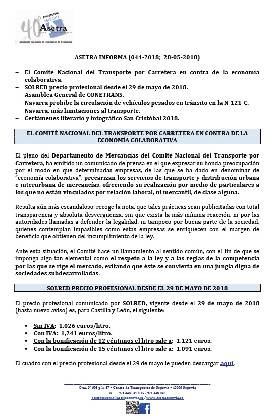 El Comité Nacional del Transporte por Carretera en contra de la economía colaborativa. SOLRED precio profesional desde el 29 de mayo de 2018. Amblea General de CONETRANS. Navarra prohíbe la circulación de vehículos pesados en tránsito en la N-121-C. Navarra, más limitaciones al transporte. Certámenes literario y fotográfico San Cristóbal 2018. Para descargar el archivo [...]