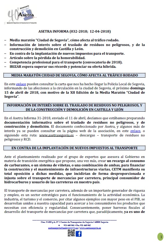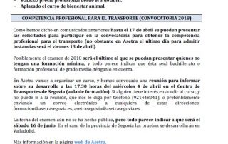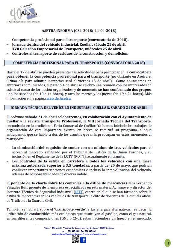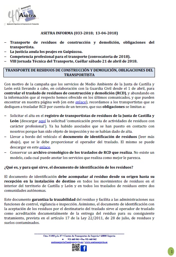 Transporte de residuos de construcción y demolición, obligaciones del transportista. La justicia anula los peajes en Guipúzcoa. Competencia profesional para el transporte (convocatoria de 2018). VIII Jornada Técnica del Transporte, Cuéllar sábado 21 de abril de 2018. Para descargar el archivo pincha aquí.