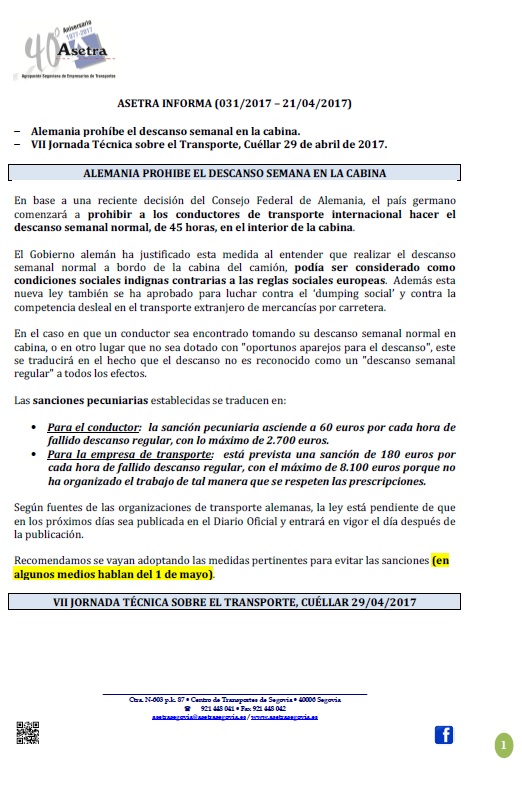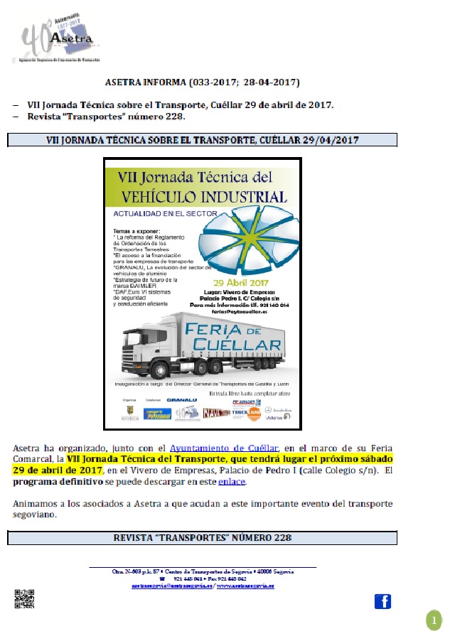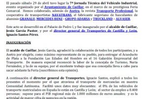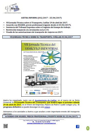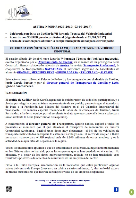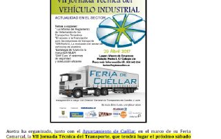 Celebrada con éxito en Cuéllar la VII Jornada Técnica del Vehículo Industrial. Acuerdo con SOLRED, precio profesional (vigente desde el 29/04/2017). Fecha del examen para obtener la competencia profesional para el transporte. Para descargar el archivo pincha aquí.