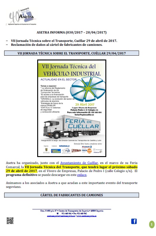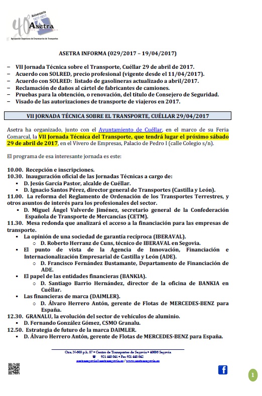 VII Jornada Técnica sobre el Transporte, Cuéllar 29 de abril de 2017. Acuerdo con SOLRED, precio profesional (vigente desde el 11/04/2017). Acuerdo con SOLRED: listado de gasolineras actualizado a abril/2017. Reclamación de daños al cártel de fabricantes de camiones. Pruebas para la obtención, o renovación, del título de Consejero de Seguridad. Visado de las autorizaciones [...]