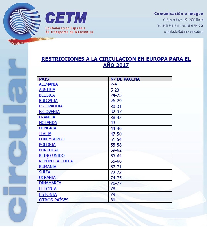 En este enlace pueden acceder al trabajo confeccionado por CETM, en el que se informa de las restricciones, y festivos, previstos en Europa para este año 2017 (como continuación a lo que ya comunicamos en el pasado mes de enero).