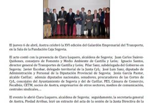 Reportaje fotográfico del 16 Galardón Empresarial del Transporte, organizado por Asetra, y que celebramos el jueves 6 de abril de 2017, en la Sala Fundación Caja Segovia. Enhorabuena a los premiados (Transalbert S.A., Confebús, y Fundación Las Edades del Hombre), y nuestro agradecimiento a los patrocinadores del evento (Irízar y Moviloc-GMV). […]