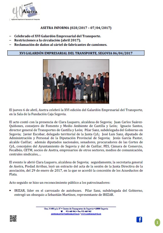 Celebrado el XVI Galardón Empresarial del Transporte. Restricciones a la circulación (abril 2017). Reclamación de daños al cártel de fabricantes de camiones. Para descargar el archivo pincha aquí.