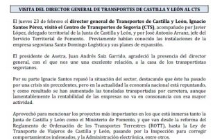 El jueves 23 de febrero el director general de Transportes de Castilla y León, Ignacio Santos Pérez, visitó el Centro de Transportes de Segovia (CTS), acompañado por Javier López, delegado territorial de la Junta de Castilla y León, y por José Antonio Arranz, jefe del Servicio Territorial de Fomento. Previamente habían conocido las instalaciones de [...]