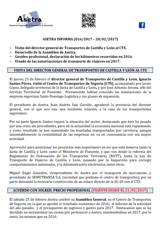Visita del director general de Transportes de Castilla y León al CTS. Desarrollo de la Asamblea de Asetra. Gasóleo profesional, declaración de los kilómetros recorridos en 2016. Visado de las autorizaciones de transporte de viajeros en 2017. Para descargar el archivo pincha aquí.