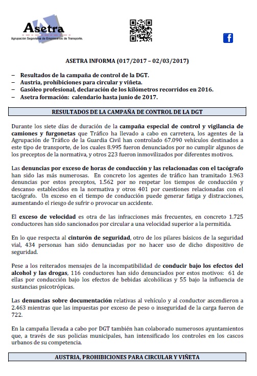 Resultados de la campaña de control de la DGT. Austria, prohibiciones para circular y viñeta. Gasóleo profesional, declaración de los kilómetros recorridos en 2016. Asetra formación: calendario hasta junio de 2017. Para descargar el archivo pincha aquí.