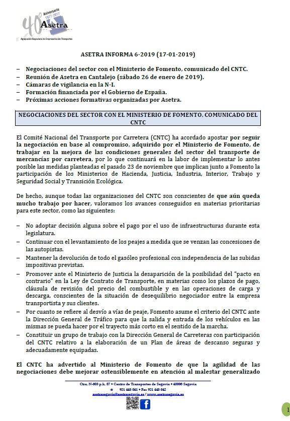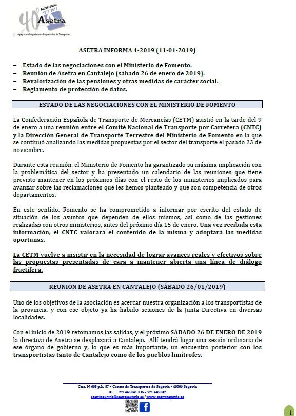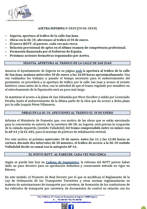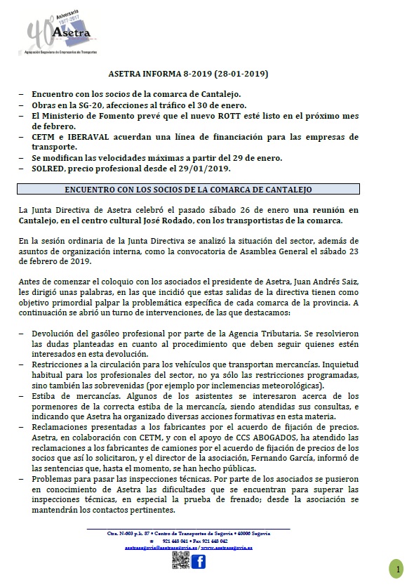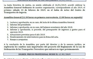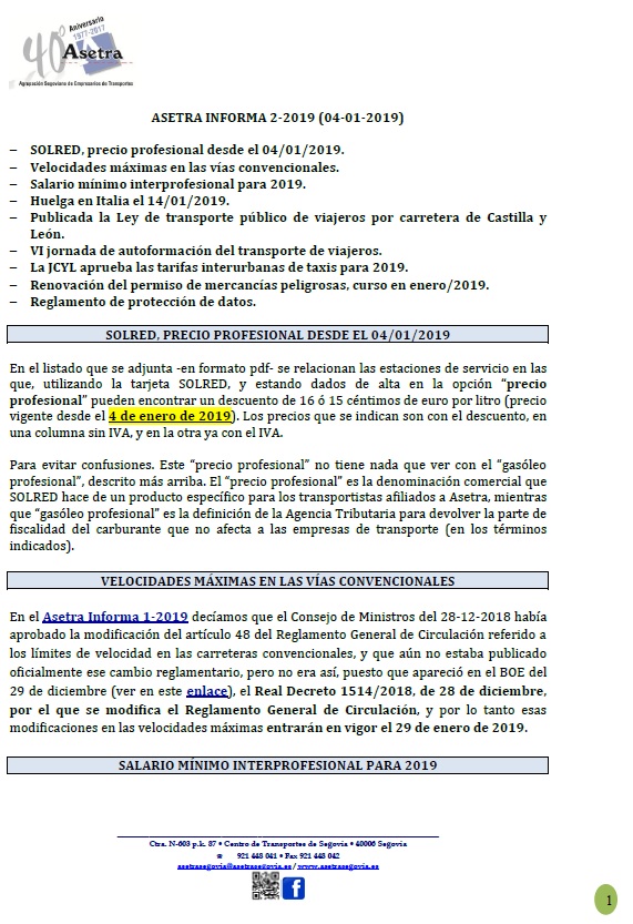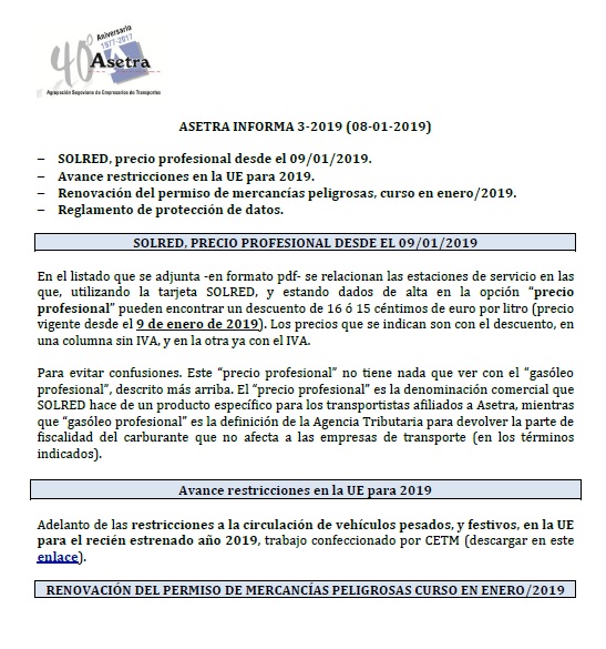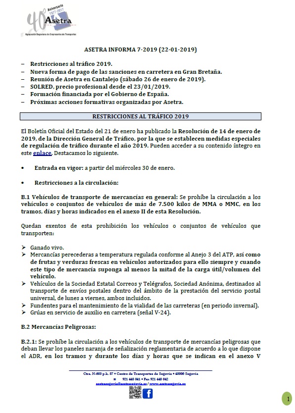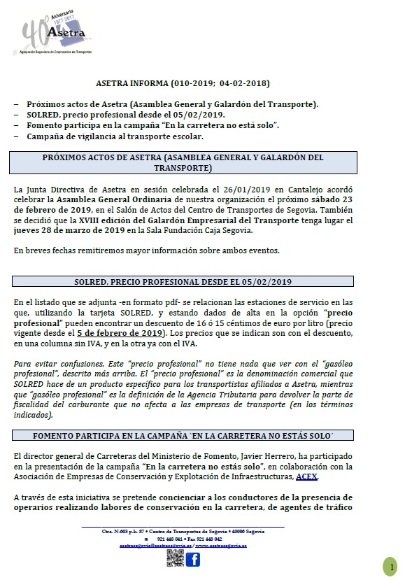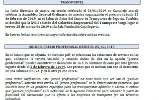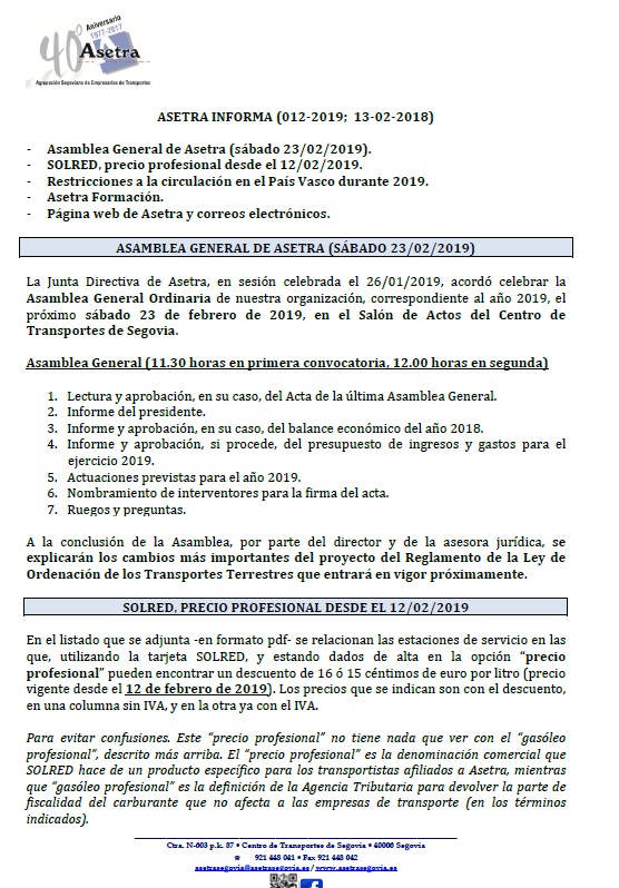 Asamblea General de Asetra (sábado 23/02/2019). SOLRED, precio profesional desde el 12/02/2019. Restricciones a la circulación en el País Vasco durante 2019. Asetra Formación. Página web de Asetra y correos electrónicos. Para descargar el archivo pincha aquí.