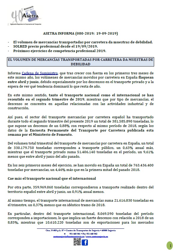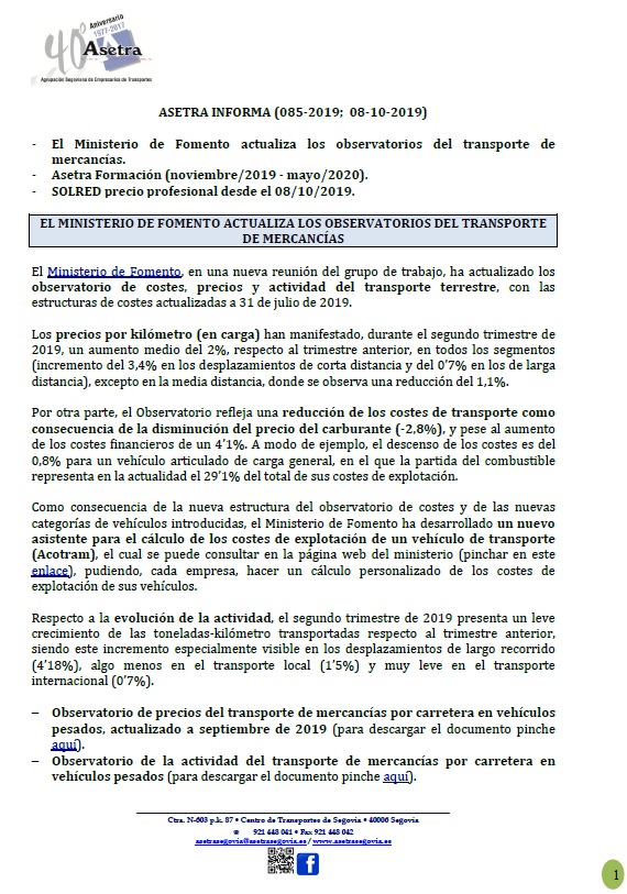 El Ministerio de Fomento actualiza los observatorios del transporte de mercancías. Asetra Formación (noviembre/2019 - mayo/2020). SOLRED precio profesional desde el 08/10/2019. Para descargar el archivo pincha aquí.