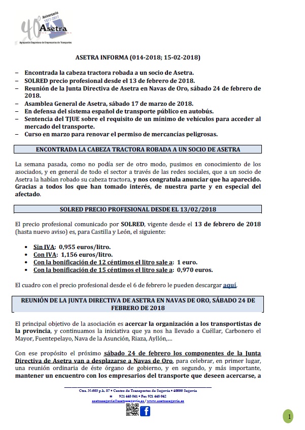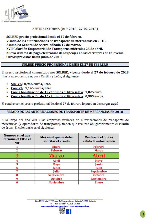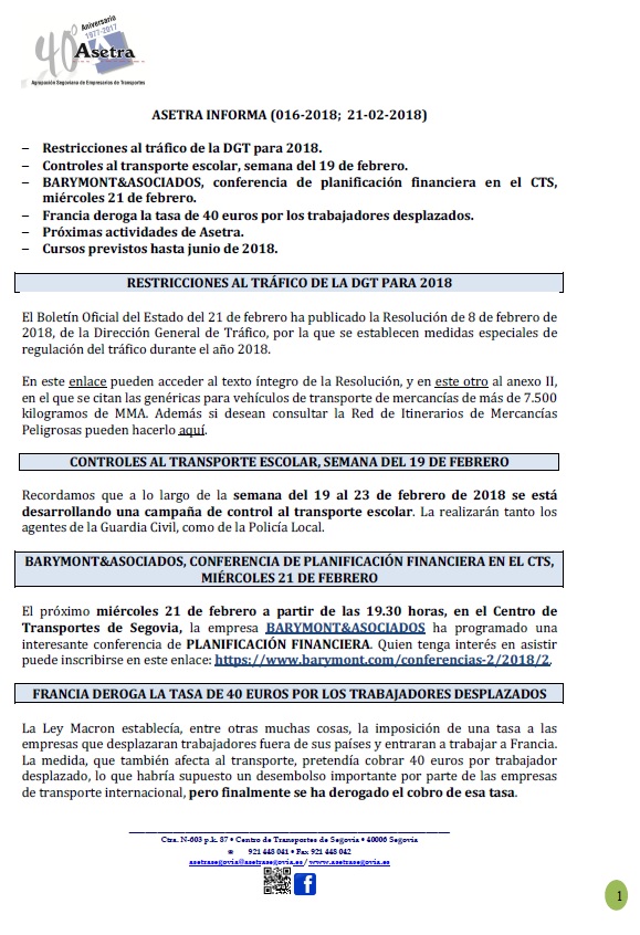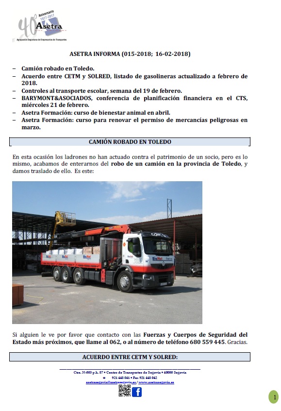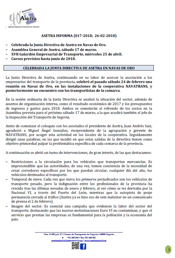 Ayudas al abandono de la actividad 2018. Asamblea General de Asetra, sábado 17 de marzo. XVII Galardón Empresarial de Transporte, miércoles 25 de abril. BARYMONT&ASOCIADOS, conferencia sobre planificación financiera en el CTS, jueves 15 de marzo. Presencia en la Feria Comarcal de Cuéllar, sábado 21 de abril. Para descargar el archivo pincha aquí.