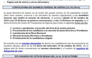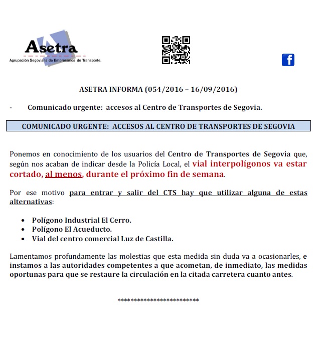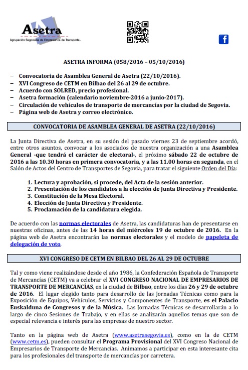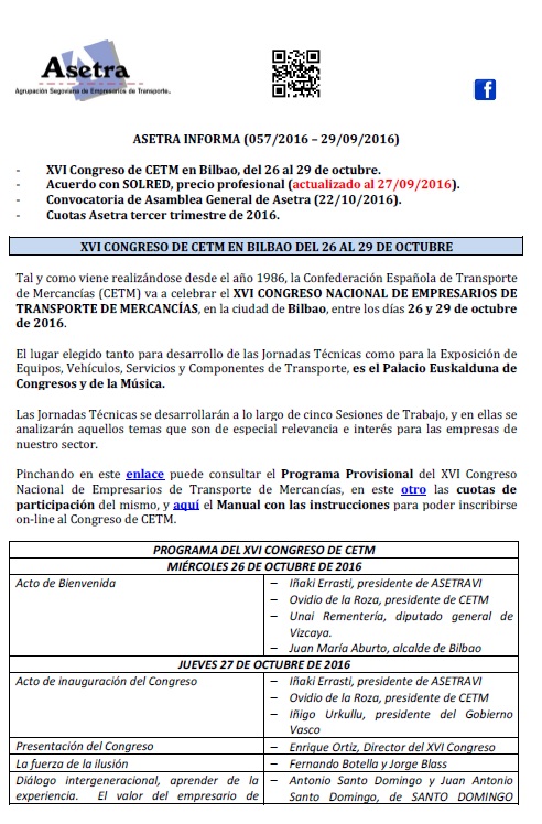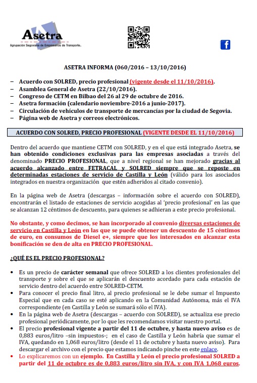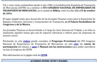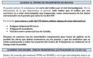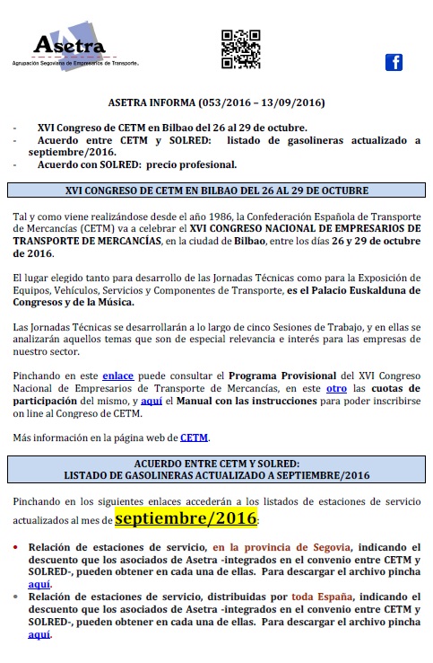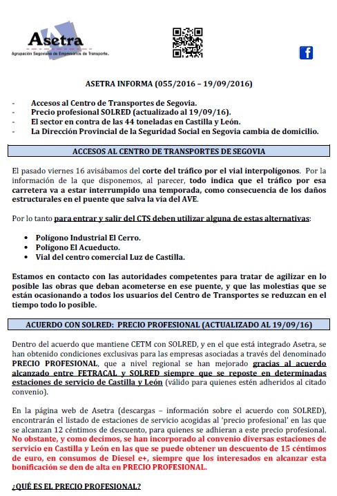 Acuerdo con SOLRED, precio profesional (vigente desde el 11/10/2016). Asamblea General de Asetra (22/10/2016). Congreso de CETM en Bilbao del 26 al 29 de octubre de 2016. Asetra formación (calendario noviembre-2016 a junio-2017). Circulación de vehículos de transporte de mercancías por la ciudad de Segovia. Página web de Asetra y correos electrónicos. Para descargar el [...]