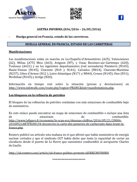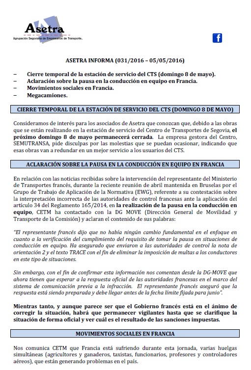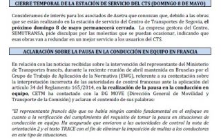Cierre temporal de la estación de servicio del CTS (domingo 8 de mayo). Aclaración sobre la pausa en la conducción en equipo en Francia. Movimientos sociales en Francia. Megacamiones. Para descargar el archivo pincha aquí