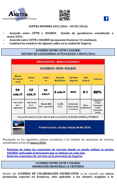 Acuerdo entre CETM y SOLRED: listado de gasolineras actualizado a mayo/2016. Acuerdo entre CETM y SOLRED (promoción fronteras 15 céntimos). Cambian los nombres de algunas calles en la ciudad de Segovia. Para descargar el archivo pincha aquí