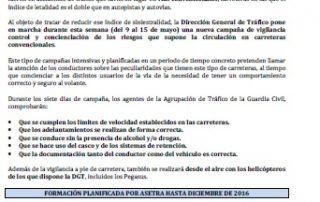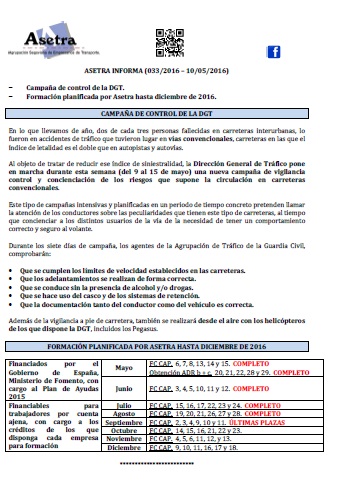 Campaña de control de la DGT. Formación planificada por Asetra hasta diciembre de 2016. Para descargar el archivo pincha aquí