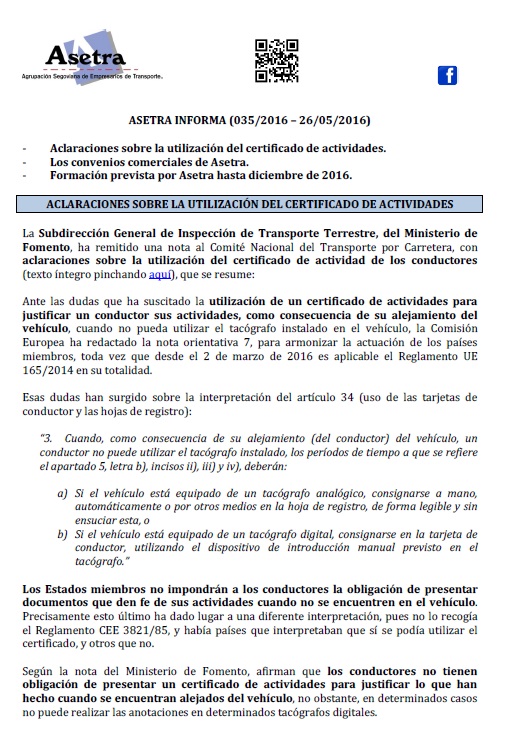 Aclaraciones sobre la utilización del certificado de actividades. Los convenios comerciales de Asetra. Formación prevista por Asetra hasta diciembre de 2016. Para descargar el archivo pincha aquí