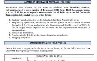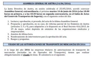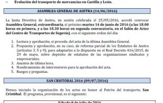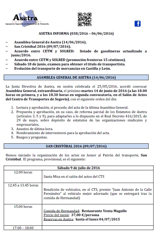 Asamblea General de Asetra (14/06/2016). San Cristóbal 2016 (09/07/2016). Acuerdo entre CETM y SOLRED: listado de gasolineras actualizado a junio/2016. Acuerdo entre CETM y SOLRED (promoción fronteras 15 céntimos). Sábado 18 de junio, examen para obtener el título de transportista. Evolución del transporte de mercancías en Castilla y León. Para descargar el archivo pincha aquí