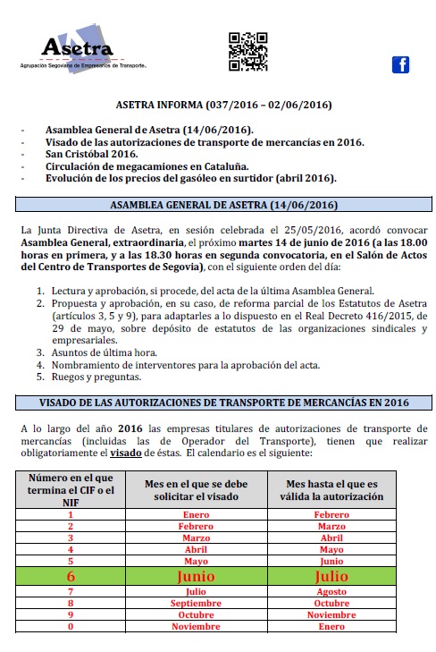 Asamblea General de Asetra (14/06/2016). Visado de las autorizaciones de transporte de mercancías en 2016. San Cristóbal 2016. Circulación de megacamiones en Cataluña. Evolución de los precios del gasóleo en surtidor (abril 2016). Para descargar el archivo pincha aquí