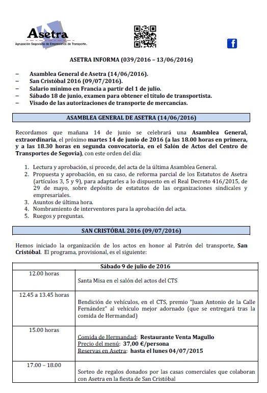Asamblea General de Asetra (14/06/2016). San Cristóbal 2016 (09/07/2016). Salario mínimo en Francia a partir del 1 de julio. Sábado 18 de junio, examen para obtener el título de transportista. Visado de las autorizaciones de transporte de mercancías. Para descargar el archivo pincha aquí