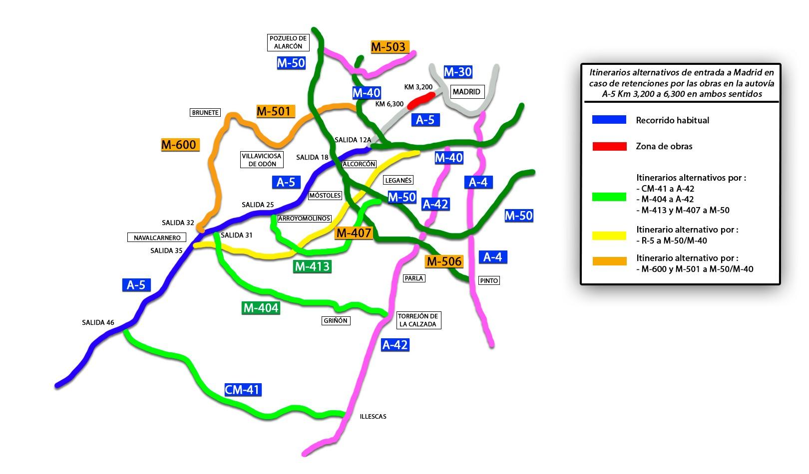 Itinerarios alternativos para evitar la zona de obras de la A-5