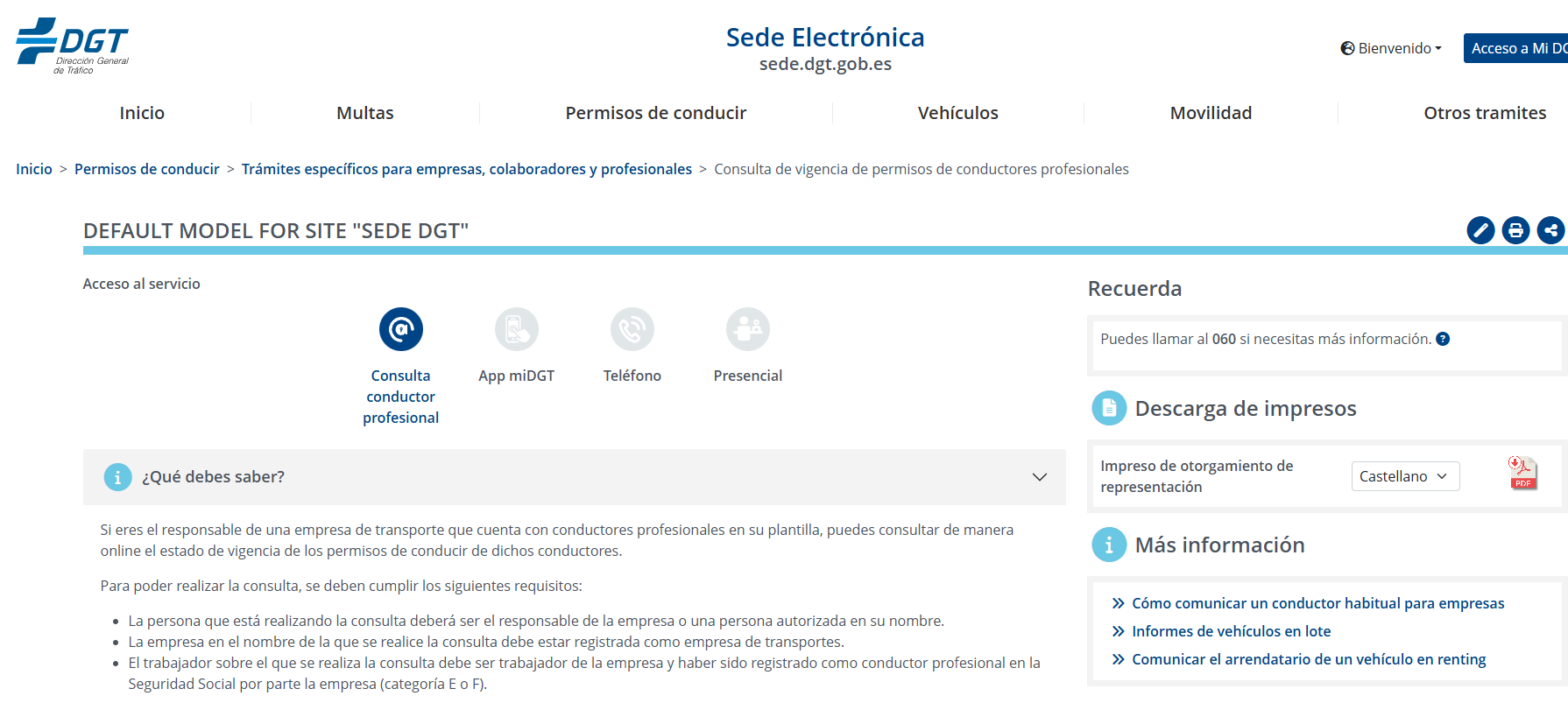 El servicio de consulta de permisos de conductor profesional debe realizarla el responsable de la empresa de transportes o cualquier persona autorizada en su nombre. La consulta será sobre un trabajador de la empresa que se encuentre contratado con la categoría de conductor profesional. La consulta de permisos de conductor profesional es un trámite gratuito.