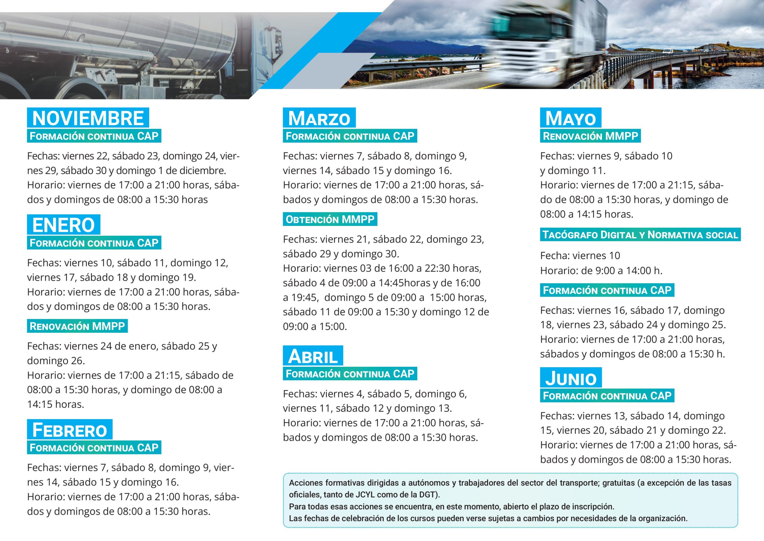 Acciones formativas programadas por Asetra desde enero hasta junio de 2025. Los cursos que se detallan cuentan con financiación pública. Gobierno de España, Ministerio de Transportes y Movilidad Sostenible, Plan de Ayudas al Sector (expediente F14/2024), para empleados del sector del transporte (mercancías o viajeros), o autónomos. En este enlace pueden ver el folleto de los cursos con las fechas programadas.