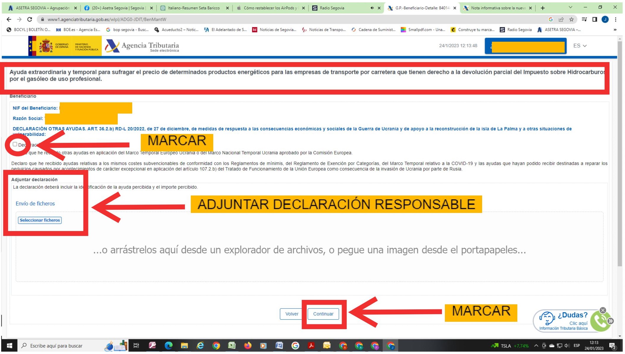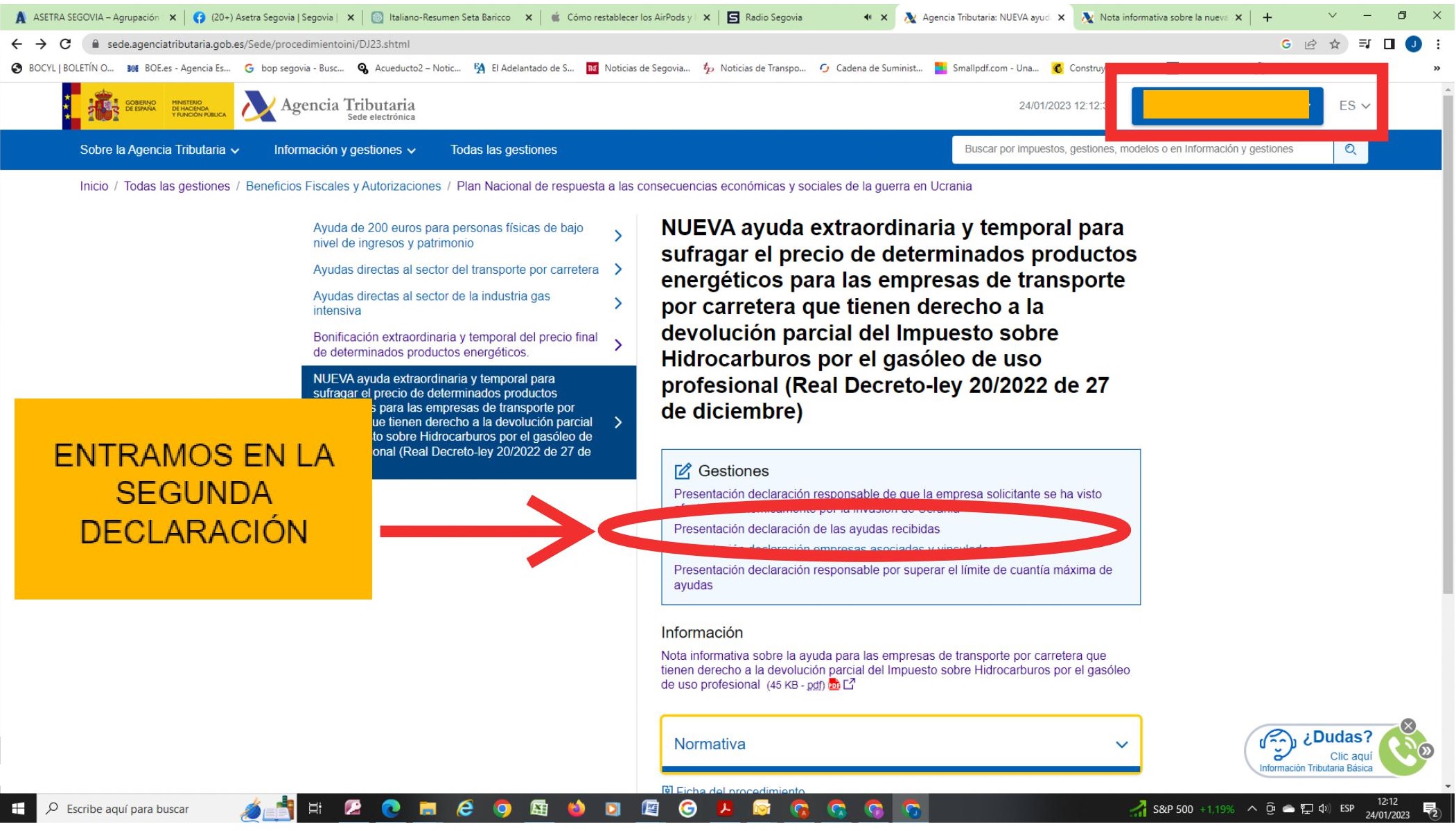 En esta segunda declaración hay que detallar las ayudas que se han percibido, las que se pidieron en abril y agosto-septiembre pasados (ayudas directas reguladas en el Real Decreto-Ley 6/2022 y Real Decreto-Ley 14/2022). Se puede utilizar el modelo de declaración que encuentran en este enlace, que habrá que anexar, siguiendo las instrucciones que explicamos en las siguientes imágenes.