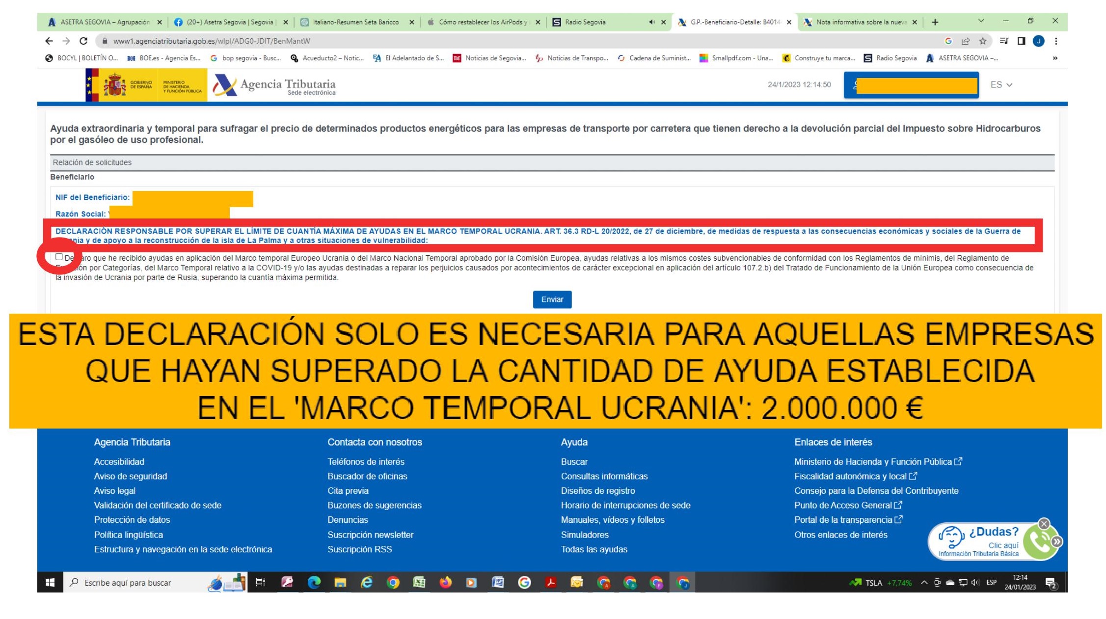 DECLARACIÓN POR SUPERAR EL LÍMITE DE LA CUANTÍA MÁXIMA DE AYUDAS EN EL MARCO TEMPORAL UCRANIA