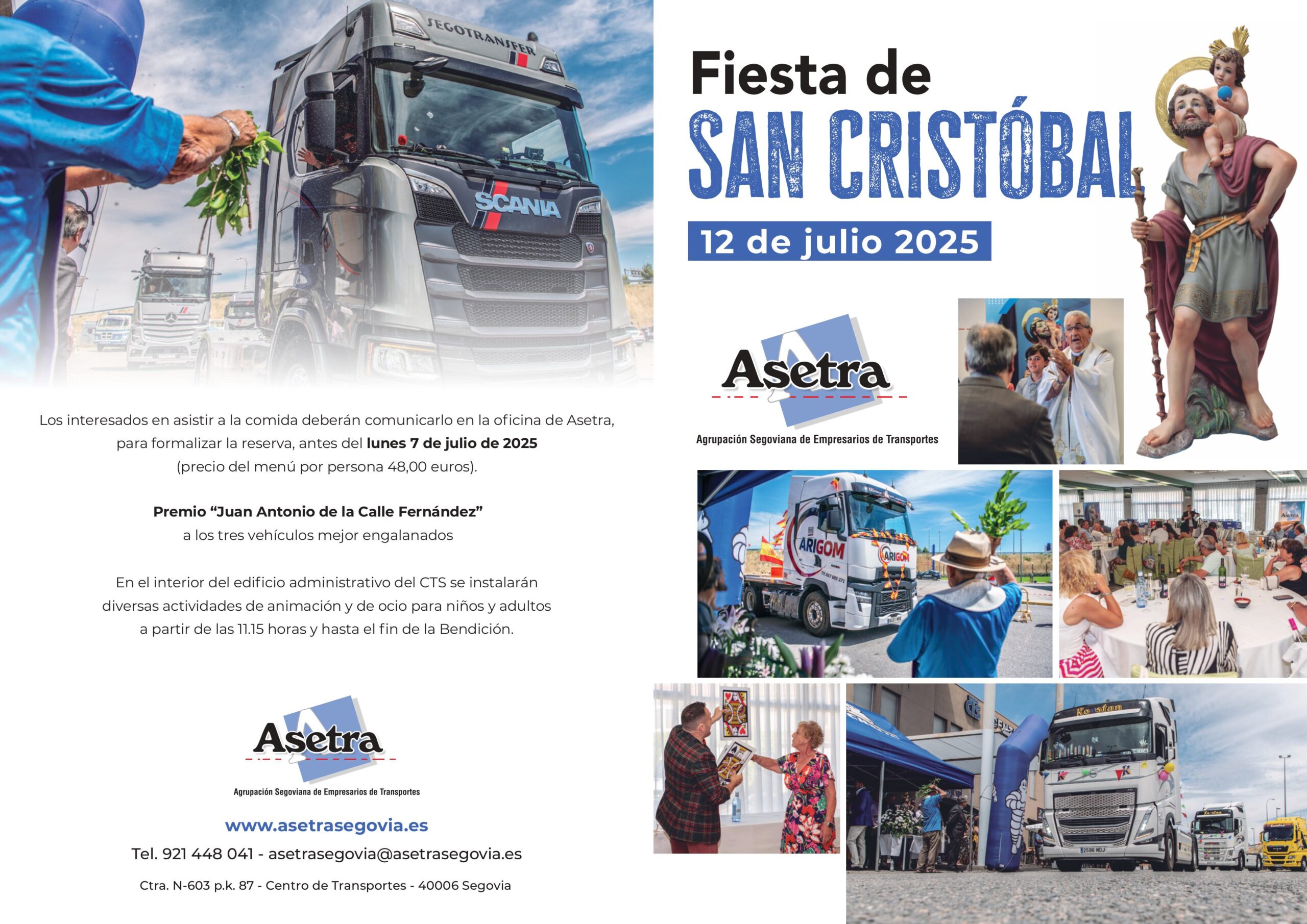 Actos organizados por Asetra con motivo de la festividad de San Cristóbal, el sábado 12 de julio de 2025: misa y bendición en el CTS, comida en el hotel Puerta de Segovia.
