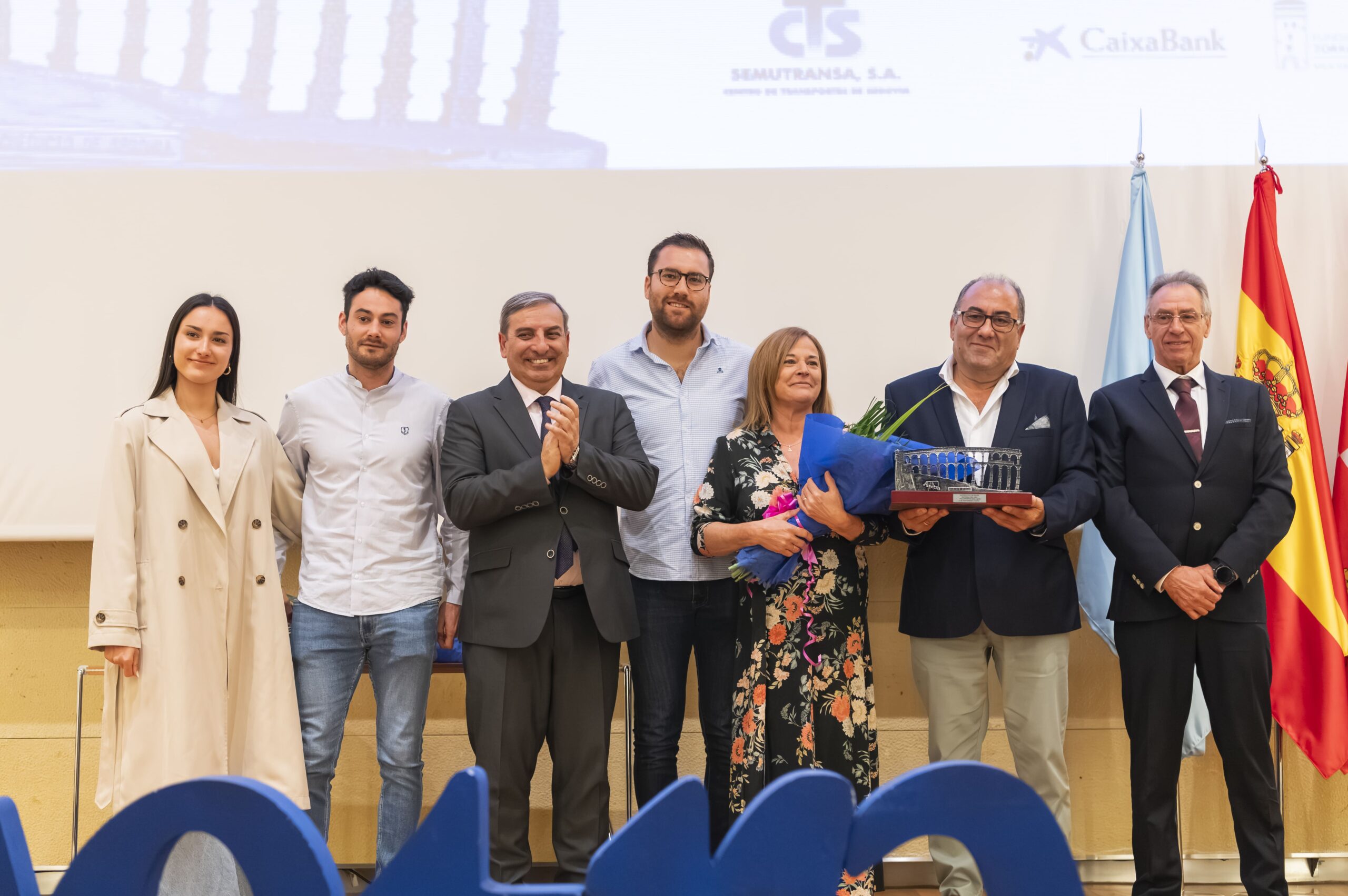 SEMUTRANSA, empresa responsable del Centro de Transportes de Segovia, recibió el primer Acueducto de Plata, entregado a Alberto Dueñas, director, y a José María Balbás, consejero, por María Ángeles Rueda y Óscar Moral, en reconocimiento a su aportación a la infraestructura logística de la provincia.