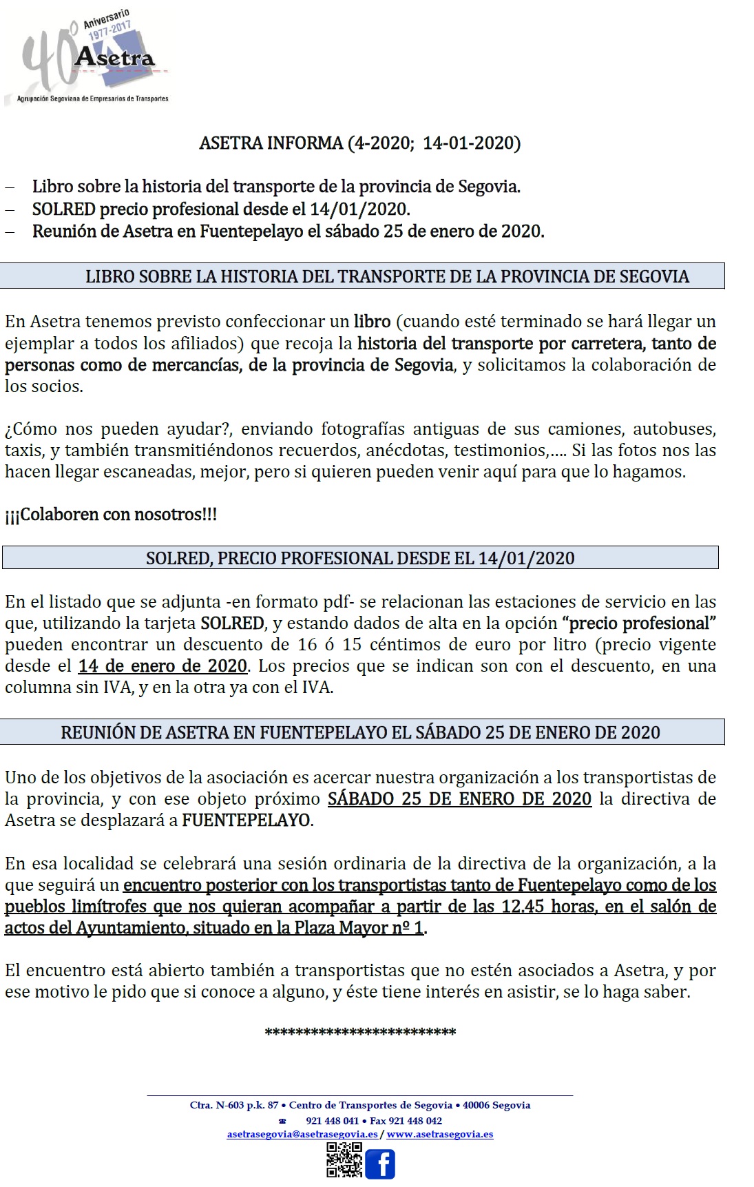 Libro sobre la historia del transporte de la provincia de Segovia. SOLRED precio profesional desde el 14/01/2020. Reunión de Asetra en Fuentepelayo el sábado 25 de enero de 2020. Para descargar el archivo pinche aquí.
