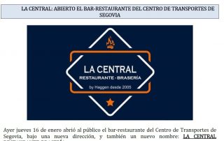 Ayer jueves 16 de enero abrió al público el bar-restaurante del Centro de Transportes de Segovia, bajo una nueva dirección, y también un nuevo nombre: LA CENTRAL RESTAURANTE-BRASERÍA. Su horario será, de lunes a viernes [...]