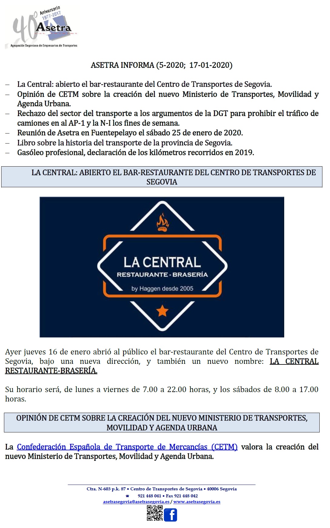 La Central: abierto el bar-restaurante del Centro de Transportes de Segovia. Opinión de CETM sobre la creación del nuevo Ministerio de Transportes, Movilidad y Agenda Urbana. Rechazo del sector del transporte a los argumentos de [...]