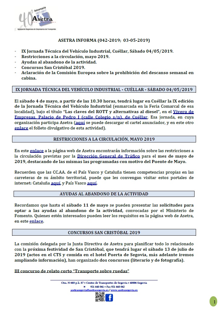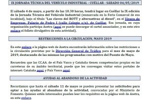 IX Jornada Técnica del Vehículo Industrial, Cuéllar, Sábado 04/05/2019. Restricciones a la circulación, mayo 2019. Ayudas al abandono de la actividad. Concursos San Cristóbal 2019. Aclaración de la Comisión Europea sobre la prohibición del descanso [...]