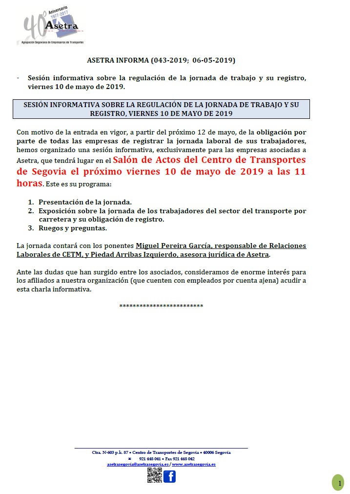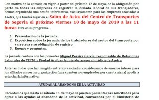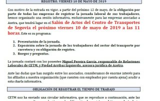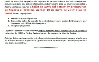 Sesión informativa, regulación de la jornada de trabajo, Asetra 10/05/2019