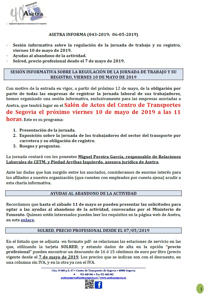 Sesión informativa sobre la regulación de la jornada de trabajo y su registro, viernes 10 de mayo de 2019. Ayudas al abandono de la actividad. Solred, precio profesional desde el 7 de mayo de 2019. [...]