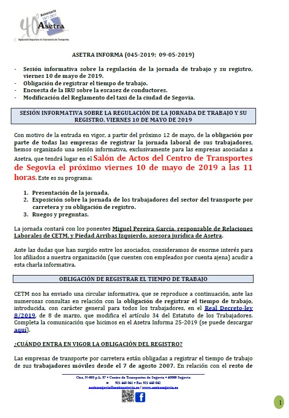 Sesión informativa sobre la regulación de la jornada de trabajo y su registro, viernes 10 de mayo de 2019. Obligación de registrar el tiempo de trabajo. Encuesta de la IRU sobre la escasez de conductores. [...]