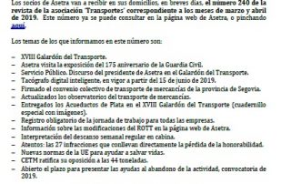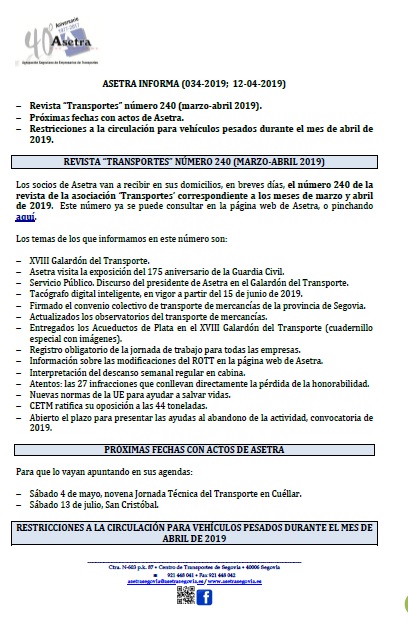 Revista “Transportes” número 240 (marzo-abril 2019). Próximas fechas con actos de Asetra. Restricciones a la circulación para vehículos pesados durante el mes de abril de 2019. Para descargar el archivo pincha aquí.