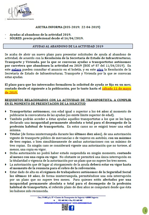 Ayudas al abandono de la actividad 2019. SOLRED, precio profesional desde el 16/04/2019. Para descargar el archivo pincha aquí.