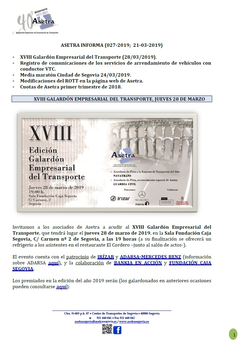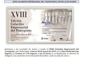 XVIII Galardón Empresarial del Transporte (28/03/2019). Registro de comunicaciones de los servicios de arrendamiento de vehículos con conductor VTC. Media maratón Ciudad de Segovia 24/03/2019. Modificaciones del ROTT en la página web de Asetra. Cuotas [...]