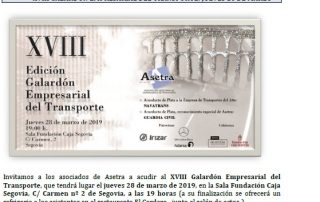 XVIII Galardón Empresarial del Transporte (28/03/2019). Conferencia sobre intermodalidad en Salamanca el 4 de abril de 2019. Relación definitiva de aptos en la prueba de competencia profesional celebrada en diciembre de 2018. SOLRED, precio profesional [...]