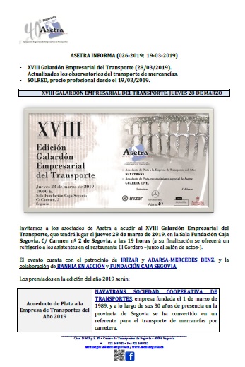 XVIII Galardón Empresarial del Transporte (28/03/2019). Actualizados los observatorios del transporte de mercancías. SOLRED, precio profesional desde el 19/03/2019. Para descargar el archivo pincha aquí.