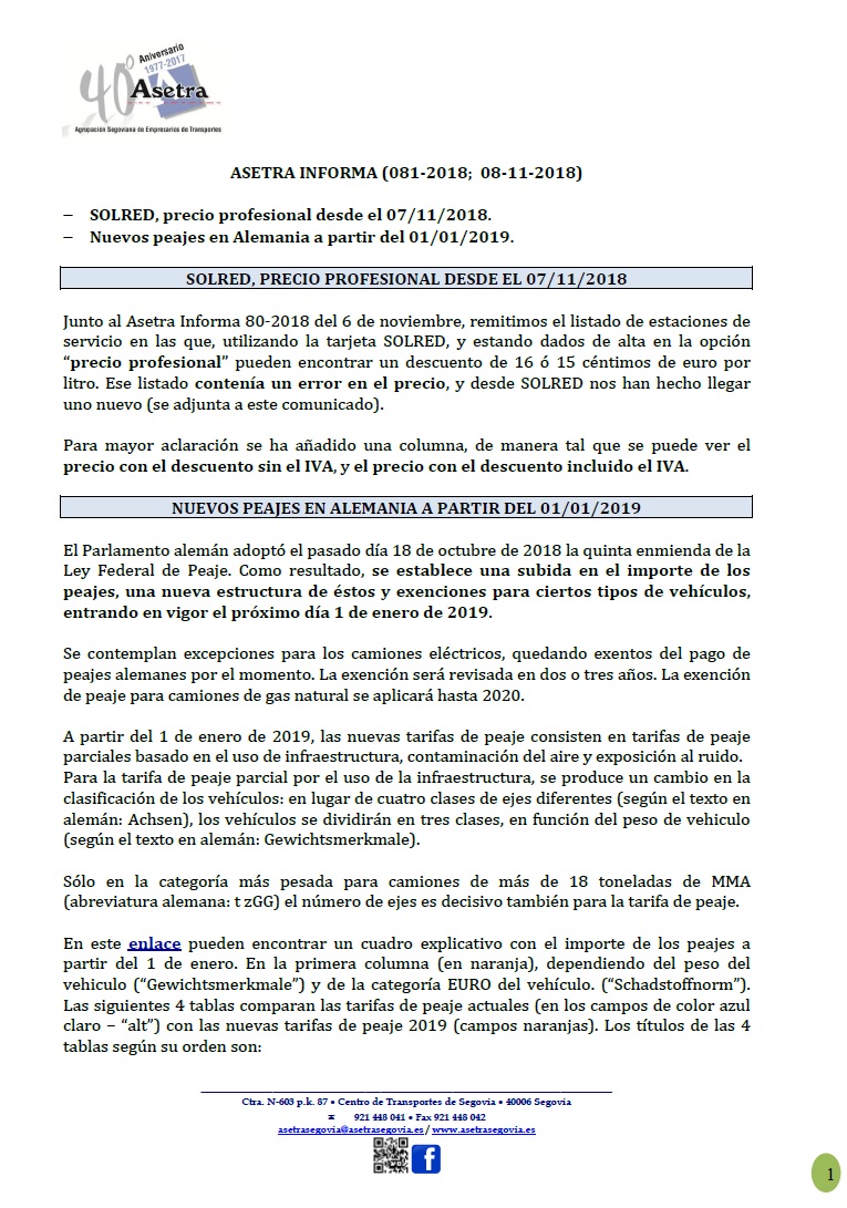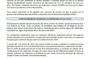 SOLRED, precio profesional desde el 07/11/2018. Nuevos peajes en Alemania a partir del 01/01/2019. Para descargar el documento pinche aquí.