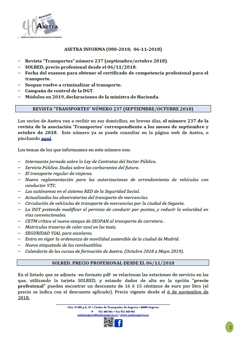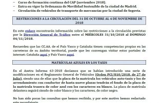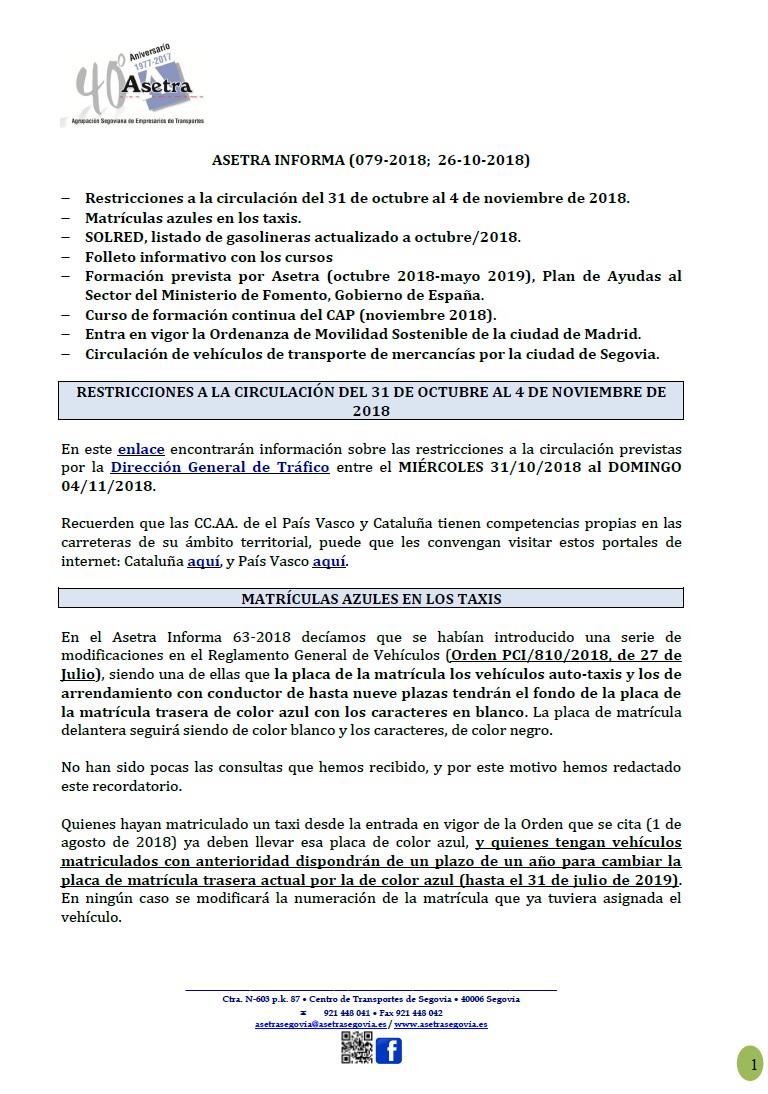 Restricciones a la circulación del 31 de octubre al 4 de noviembre de 2018. Matrículas azules en los taxis. SOLRED, listado de gasolineras actualizado a octubre/2018. Folleto informativo con los cursos Formación prevista por Asetra [...]