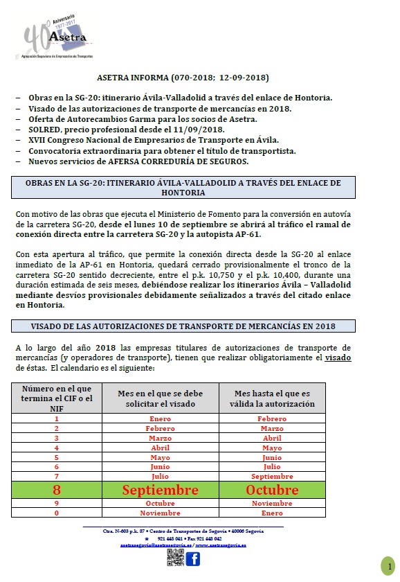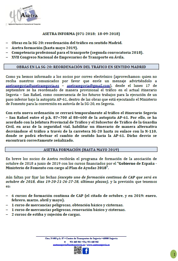 Obras en la SG-20: reordenación del tráfico en sentido Madrid. Asetra formación (hasta mayo 2019). Competencia profesional para el transporte (segunda convocatoria 2018). XVII Congreso Nacional de Empresarios de Transporte en Ávila. Para descargar el [...]