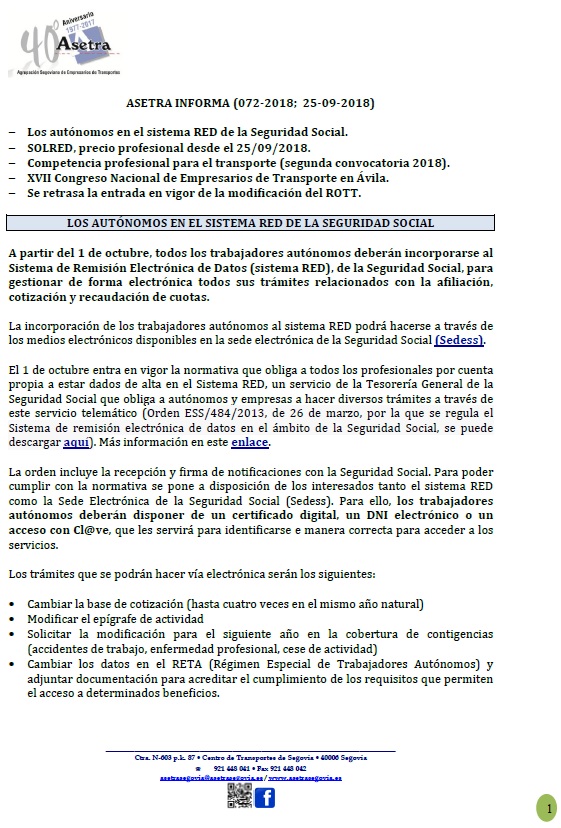 Los autónomos en el sistema RED de la Seguridad Social. SOLRED, precio profesional desde el 25/09/2018. Competencia profesional para el transporte (segunda convocatoria 2018). XVII Congreso Nacional de Empresarios de Transporte en Ávila. Se retrasa [...]