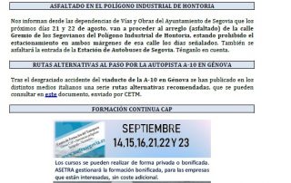 Con motivo de las obras que ejecuta el Ministerio de Fomento para la conversión en autovía de la carretera SG-20, será necesario ocupar el carril derecho de circulación entre el punto kilométrico (p.k.) 7 y [...]