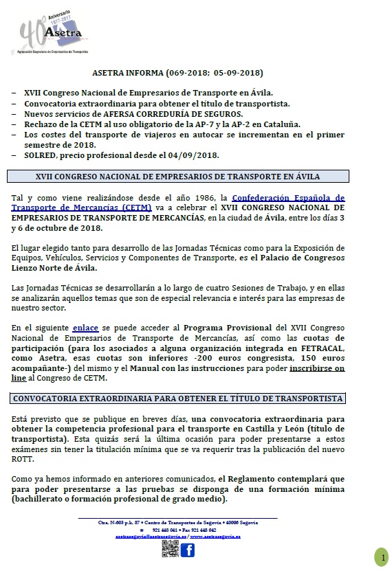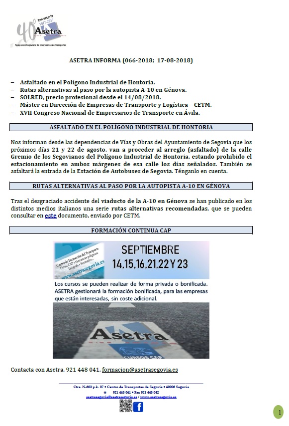 Revista “Transportes” número 236 (julio/agosto 2018). SOLRED, precio profesional desde el 28/08/2018. SG-20: afecciones al tráfico del 28 al 30 de agosto de 2018. Formación continua CAP, curso en septiembre. Para descargar el archivo pincha [...]