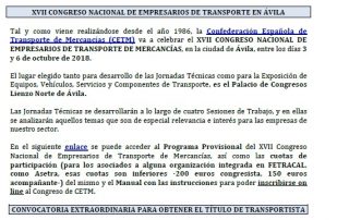 XVII Congreso Nacional de Empresarios de Transporte en Ávila. Convocatoria extraordinaria para obtener el título de transportista. Nuevos servicios de AFERSA CORREDURÍA DE SEGUROS. Rechazo de la CETM al uso obligatorio de la AP-7 y [...]
